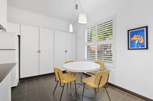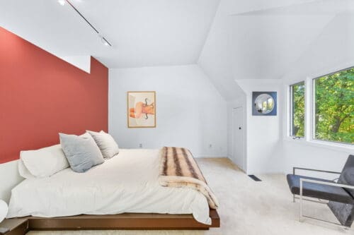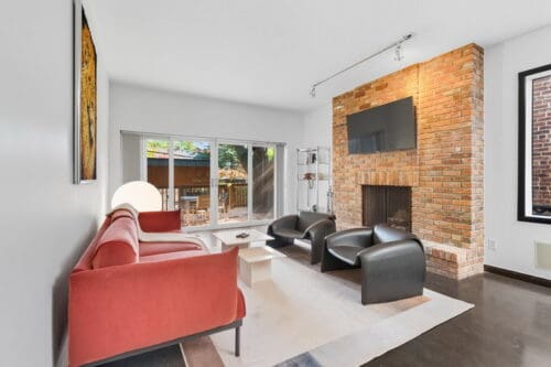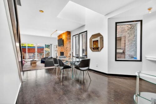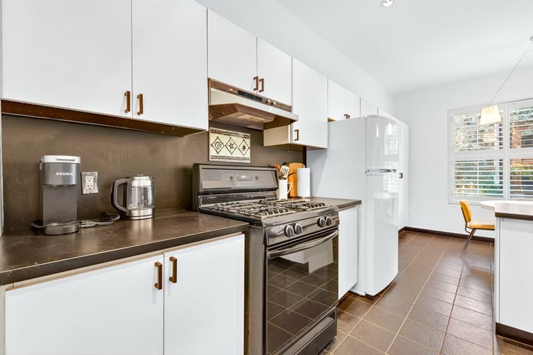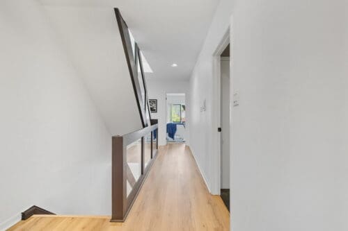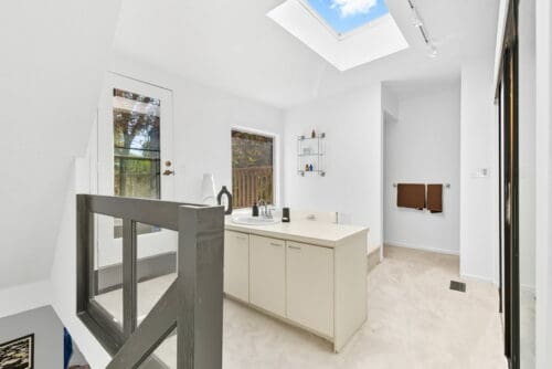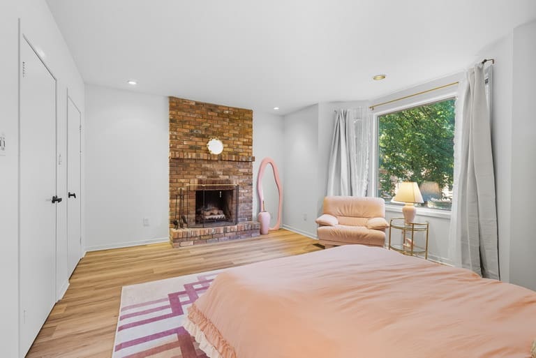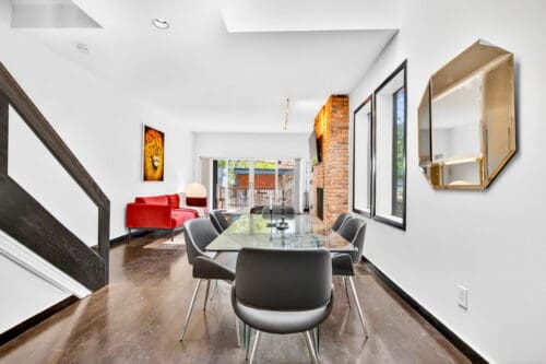This solid brick 1912 house had a complete gut renovation in the 1980’s and the interior was re-built in a spare, plain, architectural style. The plan is very open with a classic 80’s signature – an interior lightwell. All the rooms are extra large – check the bedroom sizes, and the house comes in at just under 2200 square feet – larger than many in the neighborhood. There are stunning black oak floors on the main and up the staircase.